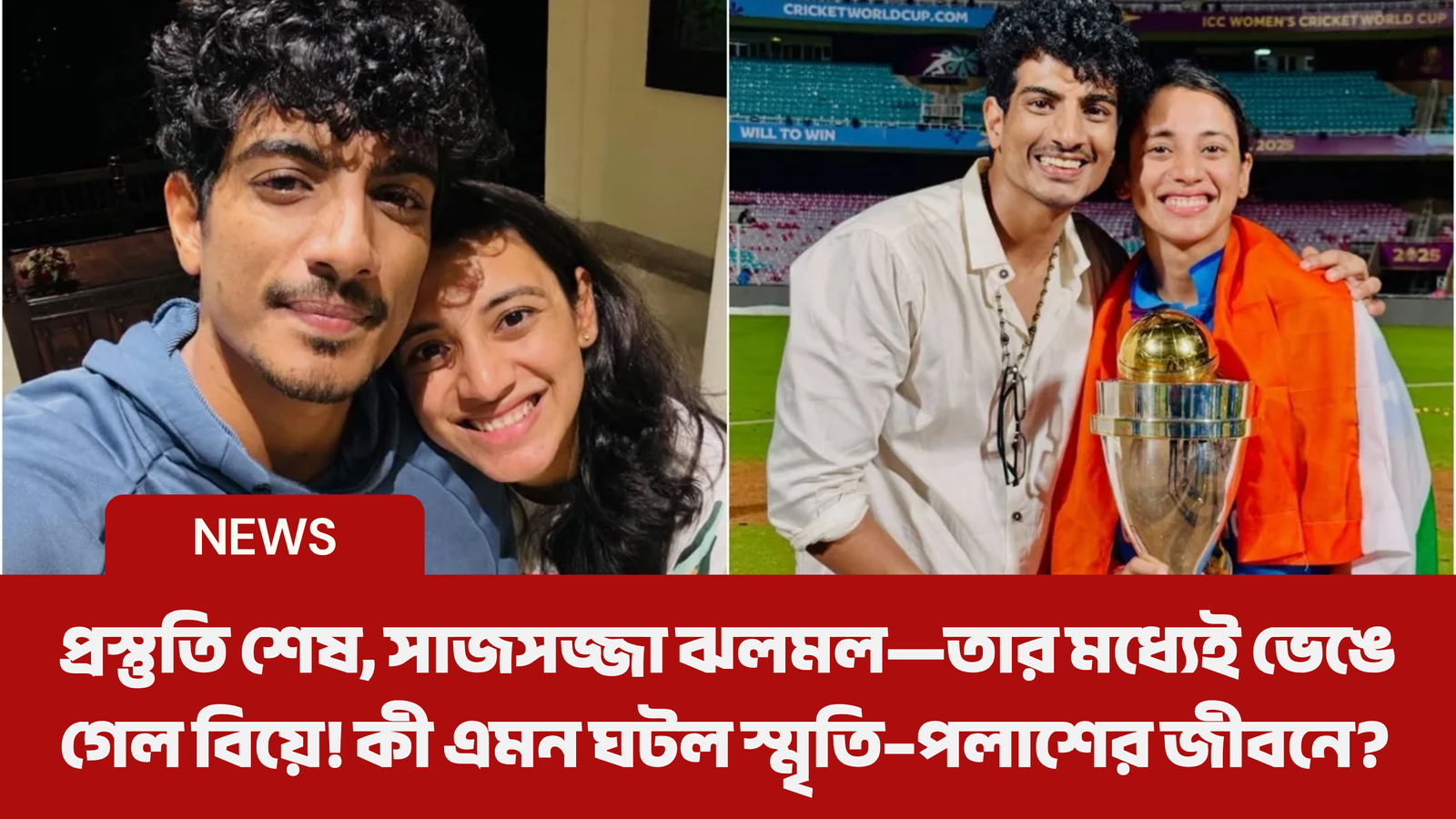 উল্লেখ্য, স্মৃতি ও পলাশের বিয়ে হওয়ার কথা ছিল ২০২৫ সালের ২৩ নভেম্বর। পরিবার, বন্ধুরা ইতিমধ্যেই পৌঁছে গিয়েছিলেন বাড়িতে। হলুদ, মেহেন্দি, সঙ্গীত—সব অনুষ্ঠানই শেষ হয়ে গিয়েছিল। সোশ্যাল মিডিয়ায় ছড়িয়ে পড়েছিল তাঁদের নাচের ভিডিওও। কিন্তু মাত্র দুই সপ্তাহের মধ্যে সবকিছু পাল্টে গেল। বিয়ের স্বপ্ন এখন শুধুই স্মৃতি হয়ে রইল ভারতীয় ওপেনারের জীবনে।